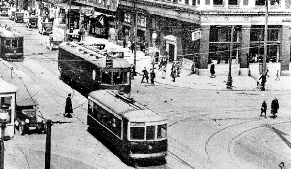 from Meadville passes a southbound Birney car at 12th and State Streets