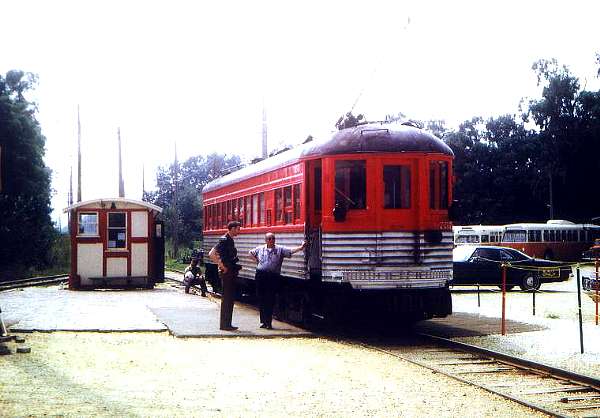 speaks with a fellow railfan. Note Milwaukee trackless trolley 350, Milwaukee